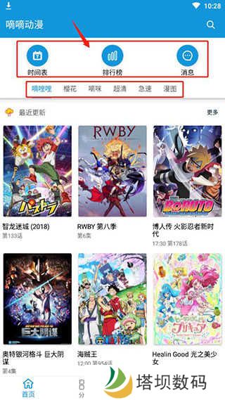 嘀嘀动漫怎么用1、进入首页了,首页为大家展示了时间表、排行榜、消息等内容,在下面还为大家提供了很多中资源动漫,比如嘀哩哩、樱花等等,大家可以选择切换观看;