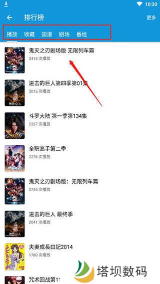 3、在排行榜中可以获取最受大家喜欢的动漫是什么,为大家提供了播放、收藏、国漫、剧场、番组等榜单,可以看到播放第一是大家都在寻找的鬼灭之刃剧场版无限列车篇;